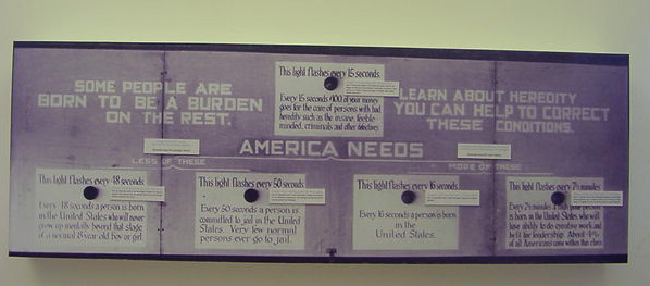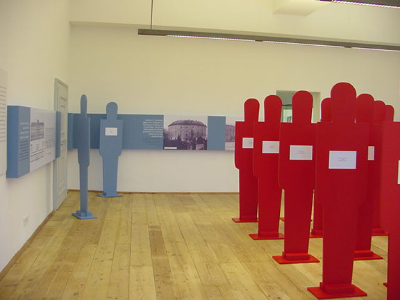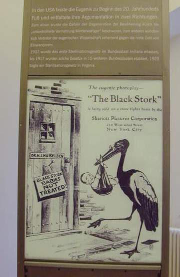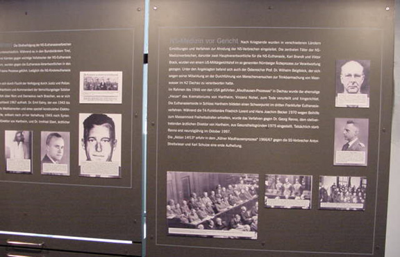 Hartheim Castle Exhibits![]() Franz Stangl was appointed by Reichsführer Heinrich Himmler to be the superintendent of the T-4 Euthanasia Program at Schloss Hartheim in 1940. He was transferred to the Sobibor extermination camp in Poland in March 1942 where he was the Commandant until September 1942 when he was transferred to the extermination camp at Treblinka. Stangl is pictured on the poster above; his photo is on the far right in the left-hand column. ![]() One room of the old castle is devoted to this display which represents the men who worked in the euthanasia program which killed those "unworthy of life." Each of the figures has the name of one of the perpetrators and the dates of their birth and death. One of the SS soldiers who worked at Hartheim was Josef Vallaster of Silbertal, Austria, who has been recently in the news. One room in the exhibit area has posters from America, as shown in the two photographs below. These posters promote the idea that heredity is to blame for the mentally and physically handicapped. In Hitler's Germany, deformed and mentally retarded persons, who had been institutionalized by their families, were sent to Hartheim Castle or the five other euthanasia centers, where they were murdered. The Nazis kept track of how much money the government had saved by putting these people to death. After the war these documents were found by General Patton's army. The total amount saved by killing over 70,000 handicapped people was 885,000,000 Reichsmark or 3 billion dollars in today's money. ![]() ![]() ContinuePreviousBack to Hartheim indexHomeThis page was last updated on February 17, 2008 |