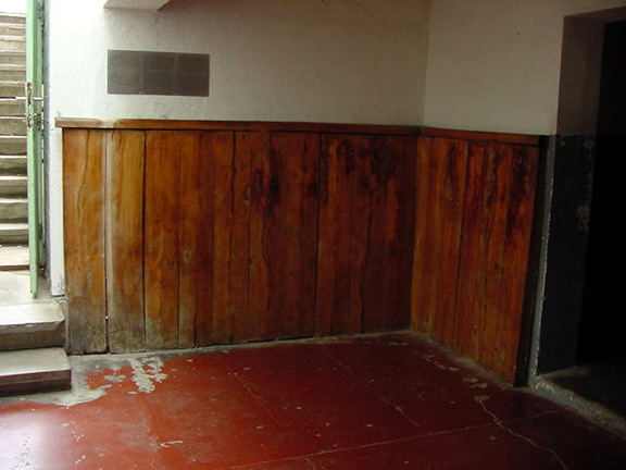 Mauthausen Execution Room![]() This is the spot where condemned prisoners were executed by a shot in the neck. The sign on the wall says that prisoners had to stand in front of a fake measuring device and were shot from behind after they were fooled into thinking that their height was being measured. There does not seem to be a hole in the wall through which the shooter could point his gun. On the left in the photo above is the door to the outside stairs which lead to the area between the bunker and the hospital building. To the right is the doorway to the hall leading to a door on the west wall of the gas chamber. The photograph below shows the metal bar under the skylight where condemned prisoners were hanged. The skylight is to the left of the stairs shown in the photo above. ![]() ![]() A third crematory oven formerly stood in this spot in the underground area beneath the space between the hospital building and the bunker. Behind the camera is the wood-paneled execution spot, shown in the first photo on this page. Prisoners were executed in front of the oven and their bodies were then cremated. On the right side of the photo above, one can see part of a porthole window opening to the outside courtyard behind the bunker. An exit door to the courtyard is to the right; it is shown in the photo below. ![]() This is the exit door from the empty crematorium room shown in the photo above. The area in the foreground is the narrow courtyard behind the bunker building. Gas Chamber ExteriorPreviousHome