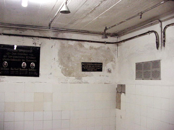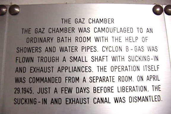 Sign on Mauthausen Gas Chamber Wall![]() The photo above shows the memorial plaques on the east wall of the gas chamber. On the south wall to the right is a sign in six languages, including English, which says that Zyklon-B poison gas was used to murder prisoners in this room. Below the sign, on the south wall in the corner of the room, is a place where four of the ceramic tiles have been removed from the wall; on the other side of this wall is the "separate room" which, according to the sign, shown in the photo below, was where "the operation itself was commanded." The English text is shown in the photo below. ![]() The plaque shown in the photo above was in the gas chamber in May 2003. In April 1989, there was a different sign with slightly different wording. The English version of the sign in 1989 was as follows: The gas chamber was camouflaged as a bathroom by sham showers and waterpipes. Cyclone B gas was sucked in and exchanged through a shaft (situated in the corner on the right) from the operating room into the gas chamber. The gas-conduit was removed shortly before liberation on April 4th, 1945. Note that, in 1989, the date given for the removal of the gassing apparatus was April 4, 1945. In May 2003, the sign in the gas chamber gave the date of removal as April 29, 1945. The photo below shows a memorial plaque for Ludwig Haider who was gassed on April 23, 1945, less than two weeks before the camp was liberated on May 5, 1945. At the time that Ludwig Haider was gassed, a Red Cross representative was in the camp and selected prisoners were being evacuated to neutral countries, but in spite of this, the gassing continued right up to the end. ![]() ![]() Four tiles had been recently removed from the south wall and three chips had been removed from two other tiles when the photo above was taken in May 2003. The gassing apparatus was formerly on this wall, but near the floor. It consisted of a pipe with a slit turned towards the wall. The SS staff apparently saved some of the leftover tiles when they built the building, and the place where the pipe was removed was repaired so perfectly that today the location cannot be detected. These tiles were probably removed to test for traces of Zyklon-B in the Mauthausen gas chamber. Gas Chamber DetailsPreviousHome |