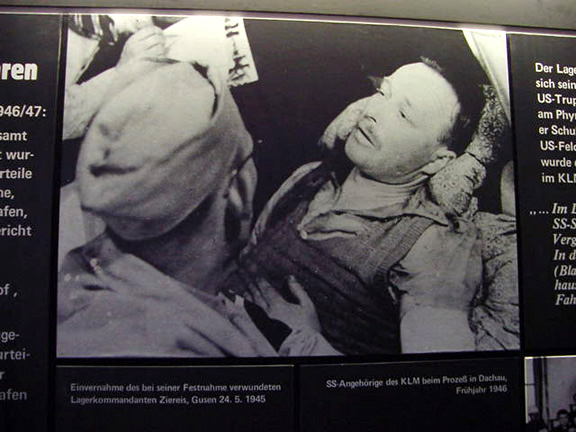The confession of Franz Ziereis, Commandant of the Mauthausen concentration camp![]() The photo above shows a display board in the Museum at the former Mauthausen concentration camp. According to the Mauthausen Museum, this photo was taken on May 24, 1945 and it shows Mauthausen Commandant Franz Ziereis as he allegedly gave his deathbed confession. According to Hans Marsalek, a Communist political prisoner in the camp, who wrote an affidavit ten months later, in which he quoted from the confession from memory, Ziereis gave his confession, during 6 to 8 hours of interrogation on the night of May 22nd and 23rd, 1945 at the Gusen sub-camp of Mauthausen. Marsalek's affadavit was entered into the Nuremberg International Military Tribunal and was used as evidence during the trial of Ernst Kaltenbrunner, although Hans Marsalek refused to take the witness stand. Note that Ziereis has been propped up for the photo, and a harness around his chest, with straps over his shoulders, appears to be holding his body upright. An unidentified man wearing an American Army cap is sitting very close to Ziereis while the arm and hand of another man can be seen in the upper left hand corner. Everything has been carefully posed to show Ziereis as he allegedly makes his death-bed confession, but notice that the three elements of the photo do not match; it looks like three separate photos that have been put together. This is a flash photo but there is more light on the arm in the background than on the soldier in the foreground. It appears that Ziereis was dead when the photo was taken. ![]() The photo above, taken in the Mauthausen Museum, shows a display board right next to the photo of Franz Ziereis, which is shown at the top of this page. The first paragraph on the sign in the photo states that Ziereis was shot on 23.5.1945 and that he died several days later in a U.S. Field Hospital in Gusen. However, according to Marsalek's affidavit, Ziereis was shot on May 22, 1945. The second paragraph on the display board shown in the photo above is a quote from the alleged confession of Franz Ziereis in which he said that a gas chamber, disguised as a bathroom, was built at Mauthausen on the order of Dr. Krebsbach; the prisoners were gassed with Cyklon-B. Besides this, there was a special vehicle which traveled between the Mauthausen main camp and the Gusen sub-camp, in which prisoners were gassed along the way. In the official version of the story, Ziereis died in an American Army field hospital at the Gusen 1 sub-camp, 6 kilometers west of the Mauthausen main camp, but not before he talked for 6 to 8 hours, confessing to the deaths of millions of prisoners, including the killing of prisoners in the gas chamber at Mauthausen and the castle at Hartheim. In a sworn affidavit, dated April 8,