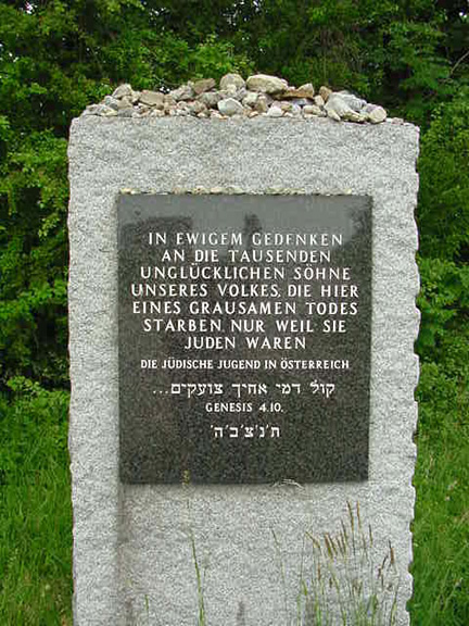 Mauthausen Memorials![]() The area on both sides of the road leading from the prisoners' entrance to the quarry, which is the area where the SS barracks were formerly located, is now filled with large Memorials in honor of the Mauthausen victims of the Nazis from 30 different countries. The first monument was erected in September 1949 in honor of the French resistance fighters who fought against the German occupation of France. The Jewish memorial, shown above, was placed in a prominent spot on the south edge of the quarry in 1976. ![]() ![]() This memorial stone, in honor of the Jews who were killed "only because they were Jews," is located at the top of the long climb up from the quarry. The stone was placed here by "Die Jüdische Jugend in Österreich" which means the Jewish Youth in Austria. The Austrian Jews were the first to be deported by the Nazis, starting soon after the Anschluss of Germany and Austria on March 12, 1938. They were not deported to concentration camps, but instead were forced to emigrate to other countries like Great Britain and America; by the time the deportation of all the Jews in Europe started in February 1942, there were around 50,000 Jews left in Austria, most of them over 60 years of age. In 1942, the majority of the Austrian Jews were deported to the Theresienstadt Ghetto in Czechoslovakia; from there, most of them were sent to the gas chambers at Auschwitz. Mauthausen was not a camp that was specifically set up for the Austrian Jews, nor even for Austrian political prisoners. Most of the Jews who died at Mauthausen had been deported in 1944 from Hungary to Auschwitz and then transferred to Mauthausen. Most of them had to live in tents under the most miserable conditions. Hungarian and Bulgarian MemorialsGDR (East Germany) MemorialAlbanian MemorialGeneral Karbyshev MemorialMemorial for Dutch & British AgentsPrivate Memorials at MauthausenHome |