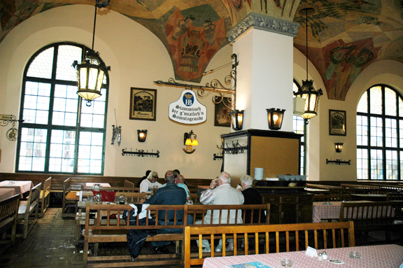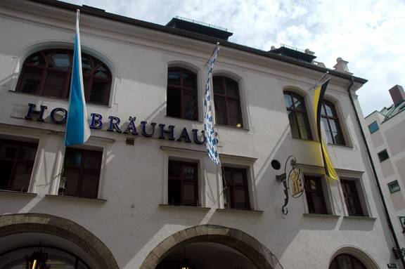 Hofbräuhaus - famous beer hall in Munich The Hofbräuhaus is a 5 minute walk northeast from Marienplatz Entrance to the beer hall is to the left Flags and emblems on the side of the building Interior in the late afternoon before the crowds arrive Stammtisch - reserved table for the locals Swastika on the ceiling has been painted over Side view of the Hofbräuhaus