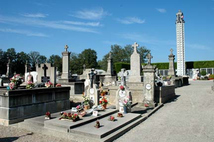 in the Oradour-sur-Glane cemetery with the tall column of the