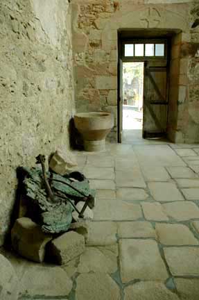 which is not the original door. The ceiling above the bells is