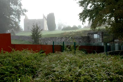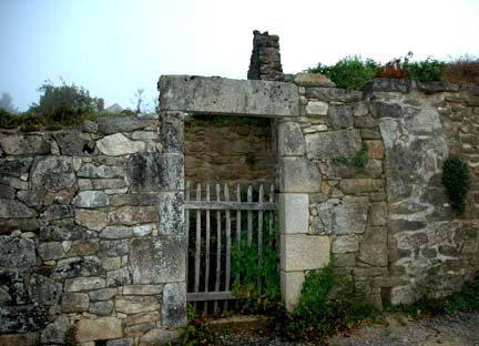 gate. In the background is the shell of a house which is also
