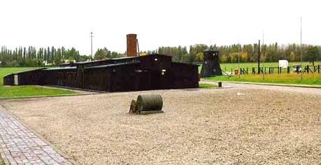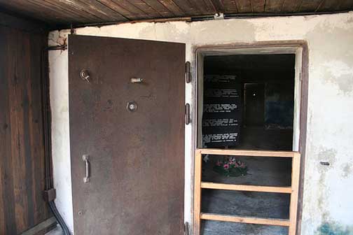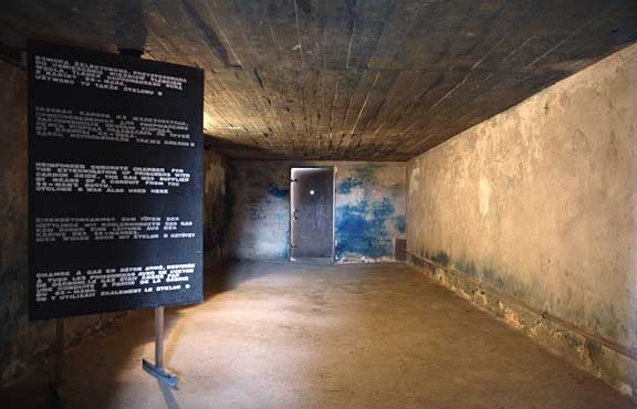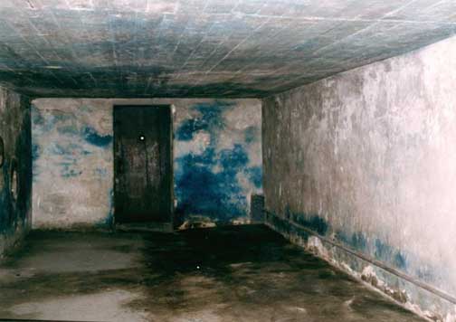 Gas Chambers at MajdanekUpon entering Barrack No. 41, which is the gas chamber building, you first come to the bare, unfurnished undressing room which has narrow wooden boards over the concrete floor. Then you enter the shower room, a large room with rows of exposed water pipes and sprinkler-type shower heads on the ceiling; this room also has a wooden floor over concrete. At one end of the shower room, there are two large concrete bathtubs. The tour guide explained that the prisoners were not allowed to loll in the bathtub, but had to get in and out in a few seconds. The bathtubs were probably filled with disinfectant, as was the case at other camps such as Buchenwald. This shower room was also used by incoming prisoners who were selected to work at Majdanek, which was a labor camp as well as an extermination camp for the Jews. ![]() ![]() An air-raid-shelter door, shown in the photo above, opens into the first gas chamber, a large room with an alcove, which resembles a three-sided room within a room. In the alcove, there are heavy blue stains, called Prussian Blue, left on the walls and ceiling by the Zyklon-B poison gas that was used there to kill thousands of Jews. The alcove is shown in the photo below and also in the photo at the top of this page. ![]() There are two doors into this first gas chamber room. When I toured the gas chambers, neither door had a lock on it and no marks where a lock might have been removed. Each of the doors had a glass peephole which is protected by tiny metal bars to prevent anyone on the outside of the room from breaking the glass. On my visit, I observed that the glass in one of the peepholes had been broken, probably from the inside, and had not yet been replaced. ![]() The main part of the first gas chamber room has a plate glass window, which lets in natural light, but it is too high up on the wall to be useful for observing the people inside. This window has no bars on either the inside or the outside. There were blue Zyklon-B stains on the window frame and the stucco around the window. The gas chamber next to the shower is the largest of the three rooms and it has the heaviest blue stains, caused by repeated use of Zyklon-B. There are two holes in the ceiling through which the Zyklon-B pellets could be dropped into the room and openings in the wall through which hot air was blown in, according to the guidebook. This room also has a wooden floor over concrete; the walls are covered with stucco. The door into the three gas chambers in Barrack Number 41 is located in the shower room. When I visited in 1998, a sign in the shower room said that the prisoners were given a shower before gassing to "quite (sic) them down." The tour guide explained that the victims were given a hot shower so they would die more quickly in the gas chamber because the Nazis found that the heat of the bodies caused the gas to work faster. Zyklon-B comes in crystal form, like tiny ice-blue rocks, and the pellets must be heated before they release the poison gas which kills lice or people. The Majdanek gas chamber building has a heating unit outside the chambers which blew hot air into the chamber to activate the poison gas, so a hot shower, before the victims entered the gas chamber, was not really necessary. At Majdanek, there are a total of four gas chambers, according to the Museum guidebook which says that the gas chamber right next to the shower room was "a makeshift chamber which presumably had begun functioning before the other three were opened." The fourth gas chamber, which is disguised as a shower room, is in the reconstructed crematorium. The photograph below shows unopened cans of Zyklon-B and a gas mask which were found in the Majdanek camp when it was liberated by the Soviet Union. ![]() In the second gas chamber in this same building, there is a small interior room which has a small barred window, about 6 by 10 inches, on one of the walls. This window had no glass and no window frame when I saw it. Through this window, the killing process could be observed by an SS guard standing in the small interior observation room, according to my tour guide. Inside the interior room were cans of carbon monoxide, which was also used in this chamber, according to the guidebook. The entrance to the small observation room is inside the gas chamber and there was no door. The tour proceeded very quickly through the gas chambers, as the tour guide wanted to get out of these creepy rooms as quickly as possible. There are a total of three gas chamber rooms, not including the small interior room used for observation, in this building. Some observers have referred to the first room with the alcove as two separate chambers. All the rooms are connected, with each room opening into the next one. The last gas chamber room in this building is smaller than the others and has no heavy blue stains. After gassing in Barrack Number 41, the bodies of the victims were hauled up the slope, along the main camp road, to the crematorium in wagons drawn by a tractor, according to survivor testimony. The Museum guidebook says that the engines were revved up while the victims were still in the chamber: "To drown the cries of the dying, tractor engines were run near the gas chambers." Here is a description of the gas chambers in "Bath and Disinfection" Building Number One (barrack #41) at Majdanek, quoted from a guidebook which I purchased at the Visitor's Center: "The gas chambers were built of ceramic brick, covered with a ferro-concrete roof, and provided with a cement floor. The installation comprised three chambers: a large one (10 m x 5.5 m x 2 m) and two smaller ones (4.80 m x 3.60 x 2 m) as well as a cabin for the SS man who pumped doses of gas from steel cylinders into the chambers and watched through a small grated window (25 x 15 cm), the behavior of the victims. Two chambers, the large one and the southern smaller one, were equipped with devices for the use of carbon monoxide (CO). In the s