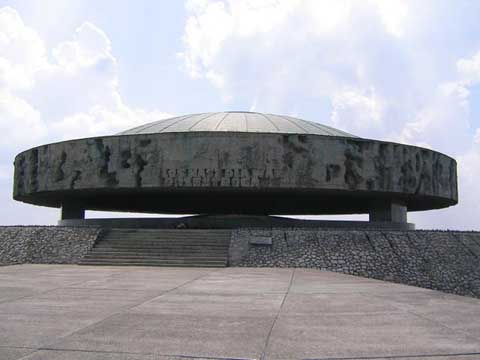 Mausoleum at MajdanekA gigantic, circular Mausoleum at the Majdanek Memorial Site stands at the end of the former "black path" to the crematorium, a walkway that is now called the Road of Homage in English. The structure was designed by architect and sculptor Wiktor Tolkin, the same man who designed the Monument of Struggle and Martyrdom at the other end of the walkway, near the street. The dome of the Mausoleum is pockmarked, as though it had suffered bomb damage in the war. The English translation of the inscription on the frieze of the dome reads "Let our fate be a warning to you." Under the dome is a huge circular urn, shaped like a saucer, which contains the ashes of some of the victims at Majdanek. Before visiting Majdanek, I had heard about the ashes and wondered what kept them from blowing away in the wind. The answer is that the ashes were recovered from a compost pile in the camp, where they had been mixed with dirt and garden refuse and composted in preparation for spreading on the vegetable garden in the camp. The material under the dome looks like compacted dirt, the color of adobe. There are a few bone fragments visible. To the left, in front of the steps, are four containers to hold eternal flames for special ceremonies. Also to the left, as you face the dome, is the very inappropriate location of the toilets, which are underground but have air vents sticking up, that look like some weird sculpture. The first thing that the tour guides explain to Americans is the toilet etiquette in Poland. In many places, including the camp at Majdanek, one must pay the attendant on duty to use the toilets. Bring your own toilet paper because there is usually none available, even though the charges are supposed to pay for the cost of the paper. The toilets are for both sexes and there is no door on the men's facility. When I visited the camp, the toilets were unbelievably filthy, just like at the Auschwitz II camp at Birkenau. The photograph above shows the Mausoleum. To the right of it is located the reconstructed crematorium building. Standing on this spot, you have a panoramic view of the camp below you. Behind the Mausoleum are new modern apartment houses, their balconies painted red, yellow and blue, resembling buildings made with children's colorful building blocks. As you are standing in front of the Mausoleum facing the camp area, to the left there are more apartment buildings in the city of Lublin. To the right, as you face the camp area, is Lublin's main Catholic cemetery which borders the camp; this cemetery was being used when the concentration camp was in operation. There are noisy black crows flying overhead, which the tour guide says are always present here, as if to give further warning to visitors. Just behind the Mausoleum pictured above, and a little to the right, is a small stone which commemorates the deaths of around 18,000 Jews on that spot on November 3, 1943, an event that was code-named by the Nazis with the cynical word "Erntefest" which means Harvest Festival in English. The camp inmates called this day "bloody Wednesday." This was the largest mass execution carried out at any of the concentration camps in the history of the Holocaust. The victims were the last remnants of the Jewish population in the Lublin district. ![]() According to the camp guidebook, Heinrich Himmler ordered the liquidation of the Jews in the Lublin district after the insurrection on October 14, 1943 at Sobibor, one of the Operation Reinhard extermination camps on the Polish-Russian border, in which 300 Jews, led by a Jewish Russian Prisoner of War, escaped into the nearby woods. At this time, the three largest concentrations of Jews in Eastern Poland were at the camp at Majdanek and at the labor camp at Poniatowa, a tiny Polish village where 18,000 people were held, and at the Polish village of Trawniki where 10,000 Jews were imprisoned in a labor camp. According to the guidebook, "In the autumn of 1943, the Nazi authorities were alarmed by the uprisings in the Warsaw and Bialystok ghettos, by the activity of the resistance movement in the camps and by the rebellions in the death camps at Sobibor and Treblinka." Their greatest fear was that the Jewish prisoners at Lublin would start a rebellion that would result in their escape to the forests where they would join the Polish partisans who were fighting the German Army. The Nazis also feared that their plans to exterminate the Jews were being thwarted by the cooperation of the camp resistance movement at Majdanek with the Polish underground organizations fighting as partisans outside the camp. The guidebook devotes a whole section to the activities of the camp resistance movement, which included activists from the Polish Home Army, and the main political parties: the Polish Socialist Party, the Peasant Party, the National Party, and the Polish Worker's Party. Along with the Polish civilian partisans and the Jewish partisans hiding in the forests, there were also escaped Russian Prisoners of War, who would sometimes shoot the Jewish partisans. Although Poland had been conquered, within a month after the country was invaded, by the joint effort of the Germans and the Russians, guerrilla warfare continued in Poland until the Germans finally surrendered to the Allies in May 1945. According to a book entitled "The forgotten Holocaust: the Poles under German Occupation," written by Richard Lucas, the Polish resistance fighters were responsible for 6,930 damaged train engines, 732 derailed trains, 979 destroyed train cars, 38 bridges blown up, 68 aircraft destroyed, 15 factories burned down, 4,623 military vehicles destroyed, 25,125 acts of sabotage and 5,733 attacks on German troops. In preparation for the mass execution at Majdanek, ditches were dug for the bodies behind the spot where the Mausoleum now stands, 50 meters away from the crematorium building. It took 300 prisoners, working two shifts day and night to dig three big ditches over 2 