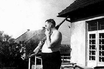 is shown standing on the balcony in the rear of his house, shooting