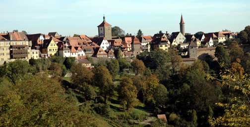 ![]() The Burgtor (Castle Gate) shown in the photo above was built after the Castle at Rothenburg was destroyed in an earthquake in 1356. The two round buildings, which were built before 1600, are the former guard house and the customs house where travelers entering the town from the Tauber valley had to pay a toll. The Rothenburg Castle was built around 1142 in the location of the present Burg garden. One of the original castle buildings was rebuilt around 1400 by mayor Heinrich Toppler; it is now the Chapel of St. Blaise. There is a memorial stone for Toppler in the Burg garden. To reach the Burgtor, walk from the Market Place down Herrengasse and go through the Burgturm (Burg Tower) shown in the photo below. The Puppet Theatre is the first building on the right before you go under the tower. The Herrengasse is the street where the wealthy patrician families formerly lived. ![]() The photo below shows the middle gate of the Burgtor bastion which has a mask with a hole for the mouth. Through this hole, the defenders of Rothenburg could pour hot pitch on the heads of their enemies who were storming the gate during an attack. Note the two openings on either side of the mask which were used for the chains to lower a drawbridge over the moat. ![]() ![]() The photo below shows some of the statutes in the Castle garden which now occupies the site of the former Rothenburg Castle. ![]() ![]() The photo above was taken from the Burggarten. It shows the Siebers Tower in the center and the Faulturm (Rotten Tower) on the right. The Rotten Tower gets its name from the fact that bodies of criminals were left to rot underneath the tower. This tower is the highest of the many round towers in Rothenburg; it is as deep as it is tall. Jewish Memorial StonePreviousHome