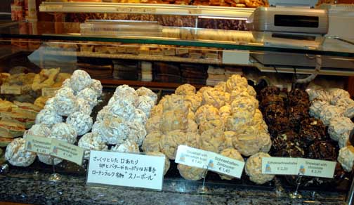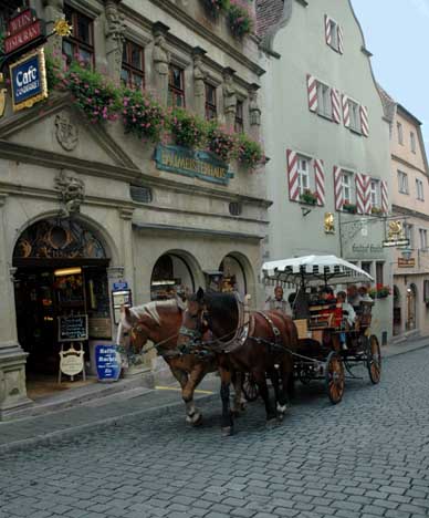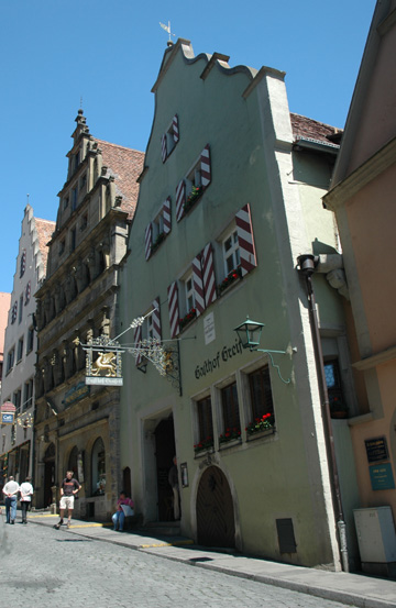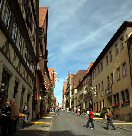 ![]() The Schmiedgasse (Smithy Lane) is one of the major streets of Rothenburg ob der Tauber. It starts at the eastern corner of the Market Place and goes south to the Plönlein (Little Place) where the name of the street changes to Spitalgasse after you pass through the Siebers Tower. On this street, you will find some of the best shops and restaurants. Note the yellow lines on the sidewalk on each side. These lines alert visitors that there are steps on this street which gently slopes downhill. ![]() The building in the photo above is the Baumeisterhaus (Master Builder House); it was the home and studio of stonemason Leonhard Weidmann, the architect of the new Rathaus building. Note the two rows of statues on the front of the building. They depict the seven virtues and seven vices, as shown in the photo below. The second photo below shows the sign over the door which has the date 1596, the year this house was built. ![]() ![]() Today this building houses a restaurant in the former courtyard on the ground floor. You can order the favorite meal of the Baumeister which is a pork steak with bacon and onions served with fried potatoes and a small side salad. The building on the right in the photo below is the former residence of Rothenburg's most famous mayor Heinrich Toppler, which dates back to 1400. It has a small restaurant with an open kitchen on the ground floor. Toppler was imprisoned in the dungeon of the old Rathaus in 1408 and legend has it that his wife tried to dig a tunnel to the prison to free him. ![]() ![]() Every German city has its food speciality, such as Berlin which is famous for its jelly donuts and Nürnberg which has its Nürnberger Bratwurst. Rothenburg ob der Tauber is famous for Schneeballen (Snow balls) which are strips of noodle pastry, formed into a ball and deep-fried for four minutes in hot fat, then dusted with powdered sugar. The photo below shows the original Schneeballen dusted with powdered sugar on the left; in the center are cinnamon flavored balls, with chocolate covered ones on the right. Note the sign in Japanese for the benefit of the many tourists from Japan. ![]() I ordered a cinnamon flavored Schneeball in a cafe on Schmiedgasse. The snowball was served in a tiny round basket, broken into four pieces, with a fork stuck in the middle. The menu gave the following description: "Schneeballträume made from short pastry deep-fried in butter-fat, served for the first time in 1719 on the occasion of an inspection of a mill." PlönleinPreviousHome