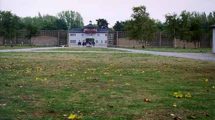 Tour of Sachsenhausen Memorial Site![]() To your left, as you face the main Museum building at the end of the entrance path, is the gate house which is the original entrance into the prisoners' area of the camp. As you walk through the iron gate of the gate house, which is shown in the photograph above, you immediately see, directly in front of you, a view of the Monument to the Anti-Fascist Martyrs. In the photo below, the monument is partially obscured by two trees on either side. On the entrance gate are the German words "Arbeit Macht Frei." Translated into English, this means "Work will set you free" or "Work liberates." ![]() According to Rudolf Höss, who was an adjutant at Sachsenhausen before he became the first Commandant of Auschwitz, "Arbeit Macht Frei" meams that works liberates one in the spiritual sense. Höss was himself a prisoner at one time and he complained about having to sit all alone in a prison cell without having any work to occupy his time. When Höss was transferred to Auschwitz, he had this same slogan put over the entrance gate to the Auschwitz main camp, called Auschwitz I. When the Sachsenhausen camp was turned into a Communist prison for German citizens, the Arbeit Macht Frei sign was removed and the prisoners did not work. Immediately in front of the gate house is the roll call area (Appellplatz), which is shown in the center of the photograph above. According to a museum pamphlet, the SS constructed a shoe testing track here in 1940 where prisoners of the penal commando had to test the soles of army boots by marching for days. The civilian director of the shoe-testing operation was Ernst Brennscheidt, who was sentenced to 15 years of forced labor after he was convicted of Crimes against Humanity by a Soviet Union Military Tribunal in October 1947. The original Sachsenhausen concentration camp was designed by 29-year-old architect SS-Untersturmführer Bernhard Kuiper in the shape of an isoceles triangle, or pyramid, with the apex of the triangle at the rear of the camp and the two equal sides of the triangle forming the side boundaries of the camp. The gate house was located at the base of the triangle in such a way that the machine guns in the guard tower on the top of the building could cover the whole camp. ![]() The wooden barracks were built in a semi-circle around the Appellplatz, as shown in two of the photographs below. All of these wooden buildings were torn down when the Soviet Union finally closed their prison for German citizens in March 1950, but the location of the barracks is indicated by a semi-circular wall which has been built to follow the line where the first row of buildings once stood. The photograph directly above is an aerial photo of the whole camp, taken in 1992. ![]() ![]() ![]() Continue TourCommunist camp for German PrisonersCamp MuseumsTable of ContentsHome |