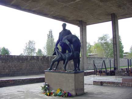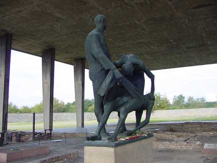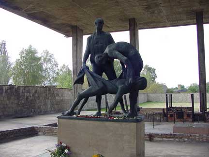 Statue at Station Z![]() ![]() ![]() This statue is metioned on page 79 of a new book entitled "Holocaust Memorials: The Emergence of a Genre" by Harold Marcuse. The following quote is from the book: A second memorial sculpture by Waldemar Grzimek, the sculpture of the bell in the Buchenwald tower, stands among the ruins of the crematrorium and execution site at the near by edge of the prisoners' compound. Only moderately larger than life-size in the more restrained figurative style of the Ravensbrück and Dachau statues, it depicts two inmates, one standing and one bent over, holding a cloth that supports the corpse of a comrade. Table of ContentsHome |