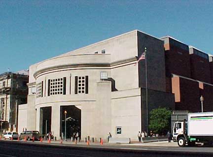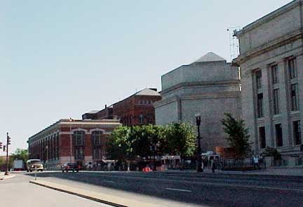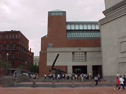 Exterior of the U.S. Holocaust Memorial Museum![]() In April 2000, I visited the US Holocaust Memorial Museum twice on two successive days. The Museum is located in the heart of our nation's capital in Washington, DC, just off the Capitol Mall. The photo above shows the entrance on 15th Street. The main entrance is on the other side of the building on 14th Street. The Capitol Mall is a long narrow park, which extends two and a half miles from the Capitol building to the Lincoln Memorial at the west end. Lined up along both sides of the Mall are our national museums of American history, art and science. The midway point of the Mall is marked by the Washington monument, which stands like a beacon in a field surrounded by American flags. The street that crosses the Mall in front of the Washington Monument is 15th street, which runs north and south, and goes past the east side of the iron fence surrounding the White House grounds. The US Holocaust Memorial Museum is about a mile from the Capitol and half a mile from the White House. It was built on Federal land with funds donated by private citizens. At the Washington monument, 15th street suddenly changes to Raoul Wallenberg Place. This section of 15th street was renamed in 1985 in honor of the diplomat who helped thousands of Hungarian Jews escape deportation to the death camp at Auschwitz-Birkenau in what is now Poland, by providing them with papers that said they intended to emigrate to Sweden after the war. Among the survivors saved by Wallenberg was Senator Tom Lantos, who emigrated to America after the liberation of Europe from the Fascists. ![]() On the corner of Raoul Wallenberg Place and Independence Avenue (the street which forms the southern border of the park-like Mall) stands an old traditional style red brick building, now called the Ross Center, which houses the administrative offices of the museum and the museum cafe. The Ross center is named after Eric F. Ross whose parents, Albert and Regina Rosenberg, died in Auschwitz in 1942. The back of the Ross Center building is on Independence Avenue while the entrance faces a brick-paved courtyard in front of the 15th street entrance to the USHMM, which is set back from the street. From the courtyard, there is a perfect view of the Washington Monument, as seen in the photograph above. The Jefferson Memorial is southwest of the museum, across the nearby Tidal Basin, but the view of it is blocked by the trees. Across the street from the museum is a park with an open field where a crowd of people congregated under a sea of umbrellas on April 22, 1993 when the museum first opened on a miserable cold and rainy day. ![]() The massive museum building, designed by Jewish architect James Ingo Freed, was built on a 1.9 acre site where another building was torn down. It took 8 years to complete, at a cost of $168 million. At the ground-breaking ceremony on October 16, 1985, soil from some of the Nazi concentration camps in Europe was mixed with the soil at the site. The photograph below shows the 14th street entrance to the museum with a traditional red-brick building next to it at the corner of 14th Street and Independence Avenue. ![]() ![]() The photograph above shows the 14th Street entrance on the east side of the museum on the left, and the red brick building which stands next to the Ross center on Independence Avenue on the right. In the center of the photo, you can see the Washington Monument, which is just behind the Ross Center. The brick courtyard in front of the west side entrance to the USHMM, shown in the photo below, is named Eisenhower Plaza in honor of General Dwight D. Eisenhower, the Supreme Commander of the Allied forces in Europe, who commanded the invasion on the beaches of Normandy, which subsequently led to the liberation of the Jews from the Nazi concentration camps in Germany. ![]() The photo above shows the facade of the Museum building, which faces Eisenhower Plaza. It has several features which suggest places associated with the Holocaust. Sticking up on the left side of the building is what looks like the tower on top of the red brick gatehouse building at Birkenau, the infamous death camp where the Jews were gassed. There are actually four of these tower-like rooms on the north side of the building; on the first floor of the Museum, these rooms contain the Daniel's Story exhibit. To the right of the tower, as shown in the photo above, is a glass enclosed walkway which looks somewhat like the open wooden walkways which were put over some of the streets of the Warsaw and Lodz ghettos in Poland so that non-Jews could pass through the ghetto on the streetcar, or walk on the street below without having to come in contact with the Jews. There are two more glass walkways on the west side of the building on the third and second floors. The Nazis initially isolated the Polish Jews in walled ghettos because they believed that the Jews were carriers of contagious diseases. There are three other glass walkways which cross the top of the building, but they appear to be merely part of the design and not functional. These walkways connect the two sides of the building which are separated by a central atrium that is four stories high and covered by a skylight. From these walkways, visitors can look down below at the main floor, called the Hall of Witness. The building has five floors above ground and a basement below; the basement level is called the Concourse. A two-part modern sculpture entitled Loss and Regeneration, designed by Jewish artist Joel Shapiro, who was born in America in 1941, stands in the courtyard with one section near the sidewalk, and the other part near the door to the museum, as shown in the photo below. ![]() The abstract black figures symbolize the destruction of European Jewry and the regeneration of the Jews; the first section is a house which has been tipped over and is now balanced precariously on the tip of one end of the peaked roof, symbolizing the