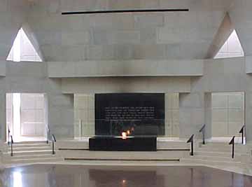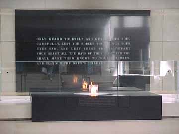 US Holocaust Memorial MuseumHall of RemembranceThe 6,000 square-foot Hall of Remembrance is on the second floor of the US Holocaust Memorial Museum in Washington, DC at the end of the tour of the permanent exhibit. It is a quiet, solemn place like a church where visitors can breathe a sigh of relief after the unsettling experience of viewing the horrors of the Nazi regime. The room has 6 sides which represent the 6 million Jews who were murdered in the Holocaust, and the 6-pointed Star of David, which is the Jewish emblem. The Hall is three stories high and there is a 6-sided skylight at the top. As you enter, the first thing you see is a rectangular block of black marble, topped by an eternal flame, as shown in the photo above. There are no real windows in the room but shafts of light are provided by narrow glass-covered slits at the four exterior corners of the building, as shown on the left in the picture. The floor is polished marble in a hexagonal pattern. The 6 walls of the Hall of Remembrance have black marble panels, engraved with the names of the major concentration camps in Poland and Germany. The 6 death camps, where the Jews were gassed, are on a separate panel. On the other side of the hall, opposite the eternal flame, are two speaker's stands, one on each side, resembling a pulpit in a church. It is from one of these stands that the President of the United States delivers his speech on his annual visit to the Hall on Holocaust Remembrance Day. ![]() The photograph above shows a closeup of the black marble block, evocative of a coffin, which contains dirt from 38 of the concentration camps in Europe. The dirt was brought to America in urns, like those used by the Nazis for the ashes of the victims who were cremated, and in a touching ceremony, the dirt was deposited inside the block by Jewish survivors of the Holocaust. Dirt from a cemetery in Europe where American soldiers are buried was also included, in honor of the American liberators of the Dachau and Buchenwald concentration camps. The black marble panel on the wall behind the eternal flame has the inscription: "Only guard yourself and guard your soul carefully, lest you forget the things your eyes saw, and lest these things depart your heart all the days of your life. And you shall make them known to your children and to your children's children." The Hall of Remembrance is the only part of the museum where photography is allowed. No flash photography is permitted, but there is enough light in the room so that flash is not necessary. There are benches around the room where groups of students congregate to have a souvenir photograph taken. ![]() The exterior of the Hall of Remembrance in the US Holocaust Memorial Museum in Washington, DC is shown in the center of the photograph above. The brick building on the left is the Ross Center; the rear of the Ross building faces the Capitol Mall. The main part of the museum is set back from the street, facing an open area called Eisenhower Plaza, but the hexagon-shaped Hall of Remembrance juts out past the building of the Bureau of Printing and Engraving on the right. ![]() The 6-sided skylight at the top of the Hall of Remembrance is shown in the photo above. The number 6 is of great importance in the story of the Holocaust. After the Jewish population of Palestine reached the magic number of 600,000, the country of Israel was born in 1948. IntroductionExterior of the MuseumInterior of the MuseumExhibits in MuseumDaniel's StoryBack to Index of the MuseumHomeThis page was last updated on September 6, 2009 |