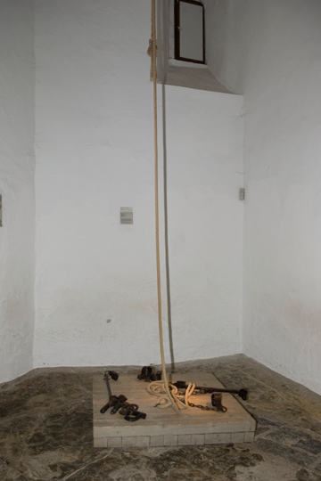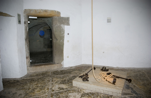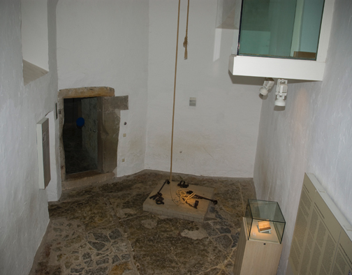 Dungeon at Wewelsburg Castle![]() The dungeon is a sub-basement underneath the basement section in the West tower of Wewelsburg Castle near Paderborn, Germany. The steep stairs to the dungeon are shown in the photo above. ![]() ![]() The photos above show "the interrogation room" for German women who were accused of being witches. They were tortured in this room until they confessed. According to the Wewelsburg Museum, this room was used in 1631 for witch trials. The bay window on the right was once the location of the judge's loge. Now it is a place where visitors can see the torture room without climbing down the steep stairs. ![]() On the left in the photo above is the present day door into the dungeon where women, accused of being witches, were formerly chained to the wall. The door is made of glass and has no latch, so it can't be accidentally locked. Just push to open it from the inside. The town of Geseke, which is only a few miles from Wewelsburg, is famous for the persecution of witches in the 17th century. The German word for witches is Hexen and Geseke was known as Hexen-Geseke. The photo below shows what is left of the Hexenturm, or witches tower, on the former city wall of Geseke. This is where witches were imprisoned before they were sent to Wewelsburg. ![]() More about the DungeonNiederhagen Concentration CampDistrict MuseumCastleNorth TowerSS Generals HallSS Vault (Crypt)Back to Wewelsburg indexHomeThis page was created on July 16, 2008 |