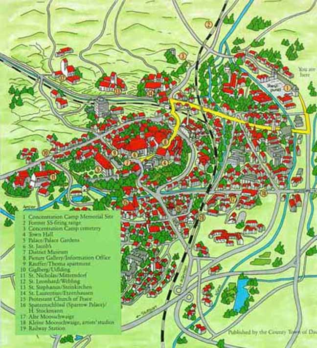 The Memorial Site at the former ConcentrationCamp is # 1 in the upper right hand corner of this map, at Alte-Roemar-Strasse75 in Dachau. The camp is 12 miles northwest of the city of Munichin Upper Bavaria. The row of red-roofed buildings behind the campwalls are the former double villas, which were the residencesof administrative personnel of the factory that was built duringWorld War I where the former Concentration Camp is now located.Therailroad tracks are represented by the black and white line goingfrom top to bottom through the middle of the map, and the railroadstation is #19 approximately in the middle of the map. #2 at thevery top of the map marks the former German SS soldiers' firingrange at Herbertshausen where Russian Prisoners of War were executed.South of the firing range, #3 at the top of the map designatesthe place where the bodies of the prisoners who died prior to,or just after the camp's liberation, were buried, on instructionsof the American Army, by Dachau farmers in a cemetery on Leitenberghill. Others were buried in the town cemetery of Dachau. Before1940 when the camp acquired a two-retort crematory, the prisonerswho died in the Dachau Concentration Camp were buried in massgraves at Leitenberg hill and other cemeteries. This map is onthe back cover of the pamphlet about Dachau , available free atthe Museum.