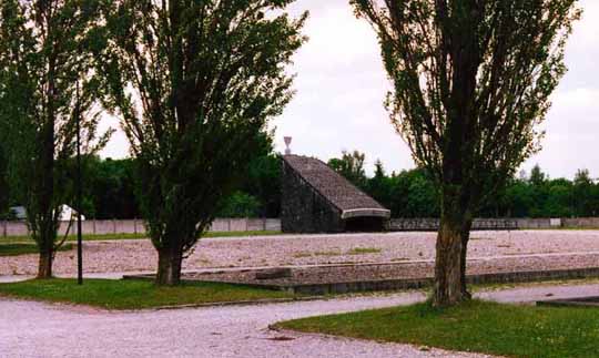 When the Dachau camp was liberated, there were2,539 Jewish survivors, including 225 women, according to theAmerican Army census. According to a survivor, Nerin E. Gun, mostof these Jews had been brought to the Dachau camp from Polandin the final days of the war and some of them had been in thecamp for only a few days when the American Army liberated thecamp. The Jewish Memorial in remembrance of the Holocaust victimsis located at some distance from the other Memorials on the eastside of the camp just in front of the wall at the north end ofthe camp. In front are the concrete foundations which are allthat remain of the barracks buildings. Behind the Memorial isthe former location of the original disinfection hut for clothingwhen the camp was in operation. The white building to the left,behind the poplar trees, is the Catholic Carmelite convent, whichwas built in 1964. Click on the link below which takes you toanother web site, or click on the picture above to continue theVirtual Tour.