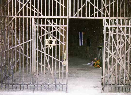 This wrought iron gate goes all the way acrossthe entrance to the underground room of the Jewish Memorial Temple,and is the only thing covering the opening to the small room,which is exposed to the elements. Note how this gate is reminiscentof the Jourhaus gate to the camp, except the iron bars are jumbledand chaotic and the "Arbeit Macht Frei" sign is absent.Inside, the floor is covered with the same tile that is used onthe ramp and the walls are granite blocks. Click on the link belowwhich takes you to another web site where you can read an essayon the Nazi justification for the Genocide of the Jews, or clickon the picture above to continue the Virtual Tour.