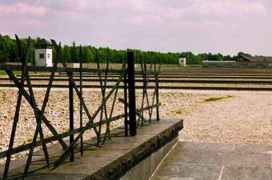 Unlike the infamous Birkenau camp in Polandwhich had barrack buildings with dirt floors, the barracks atDachau were set on concrete foundations which still remain afterthe wooden buildings were torn down. Behind the spot where theJewish Memorial now stands, there was originally a half-timbereddisinfection hut for delousing the clothing of the prisoners toprevent typhus epidemics. After the Americans liberated the camp,DDT was used to disinfect everything. The hut was torn down likemost of the camp buildings after the camp was abandoned in the1950ies. The small white buildings are the guard towers where,day and night, an SS guard would have a machine gun trained onthe prisoners in the camp. As the Americans approached to liberatethe camp, the German guards flew white flags of surrender fromthese towers, according to survivor Nerin E. Gun.