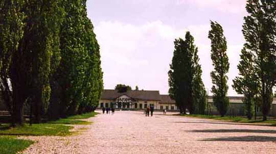Notice that some of the poplar trees have beenplanted more recently after the original trees did not survive.The original rows of trees were planted by the inmates, probablyas a wind break. The trees were originally spaced the exact samedistance from each other. The precision layout of this camp servedas a model for later Nazi concentration camps. According to accountswritten by the Americans who liberated the camp, this was a dirtroad when the camp was in operation.