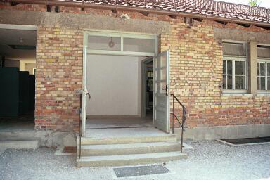 windows. To the right of the gas chamber is a mortuary room where