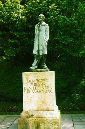 This monument is located across from BarrackX outside the walls of the former Dachau Concentration Camp. Notethe border of flowers, barely visible behind the statue. Picturesof the camp when it was liberated show flowers planted in thisarea, and even a birdhouse on a short pole. According to a bookby a survivor, there were azalea bushes planted at the DachauConcentration Camp. Click on the links below to see a pictureof Himmler, which is probably a Nazi propaganda photo, or on thelink to the postcard picture showing a close-up of the statueabove, or click on the picture above to skip these pictures andcontinue the Virtual Tour.